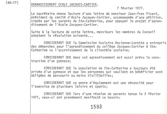 - 7 (1977): Le conseil municipal appuie la demande d’agrandissement de l’école Jacques-Cartier Jacques-Cartier (2).