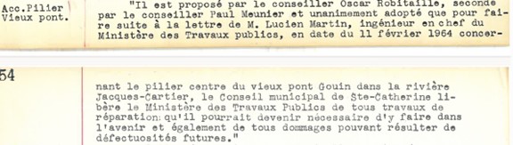 - 17 (1964): Voulant garder le pilier du pont Gouin, le conseil vote une résolution dégageant le gouvernement des coûts d’entretiens futurs.